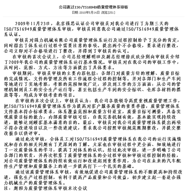 公司通過ISOTS16949質量管理體系審核